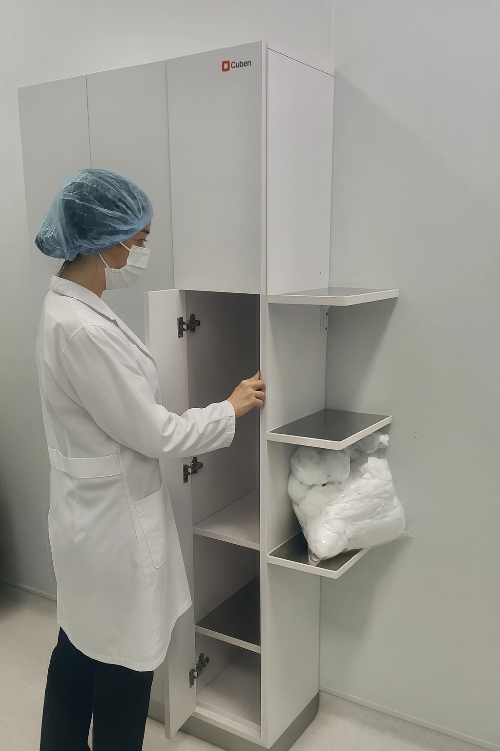 Sus superficies son lisas, lavables y resistentes a soluciones de desinfección. Incorporan zócalo de acero inoxidable, división interna para separar ropa de distintas áreas de trabajo y sistema de apertura push on (retén expulsor) sin manijas, lo que ofrece una superficie completamente lisa y de fácil higiene.